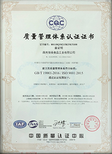 南充佳美于2008年按ISO 9000標(biāo)準(zhǔn)建立質(zhì)量管理體系,同時(shí)取得ISO 9001質(zhì)量體系認(rèn)證證書(shū),并于2018年取得ISO 9001:2015質(zhì)量體系認(rèn)證證書(shū)。